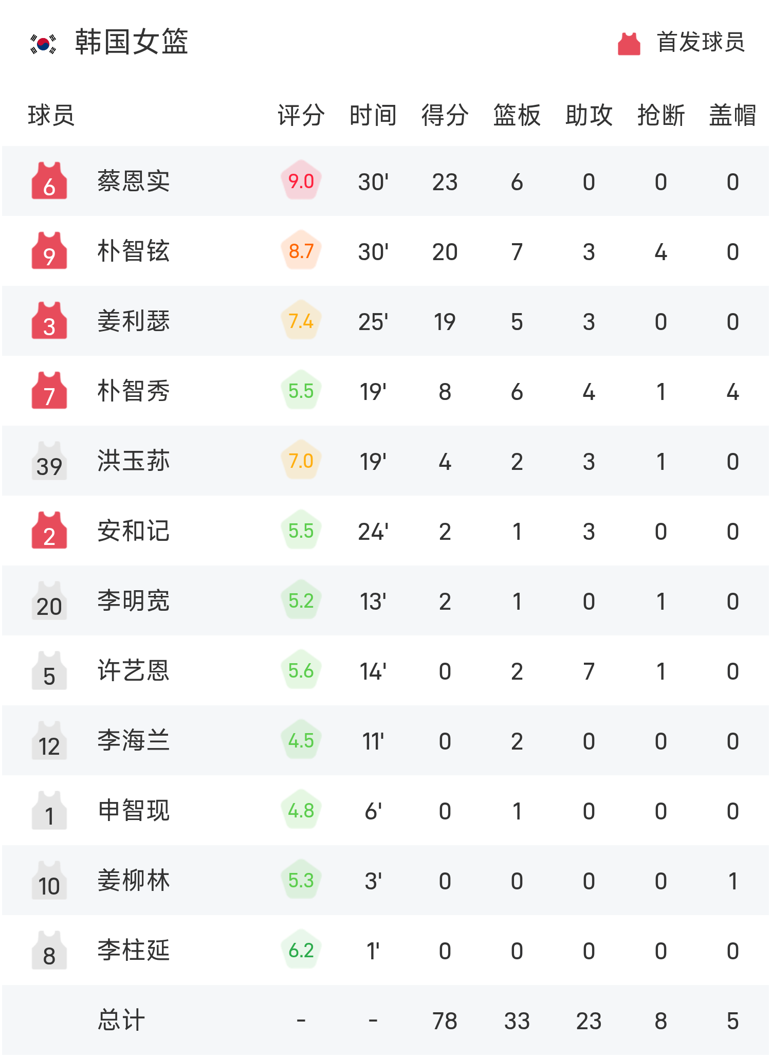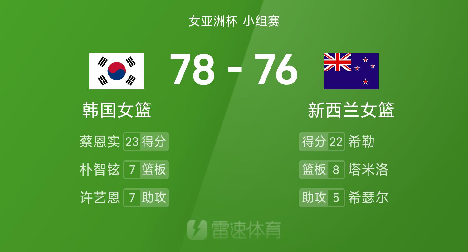 07月14日讯 25赛季女亚洲杯 小组赛,新西兰女篮对阵韩国女篮。双方全场战罢,新西兰女篮76-78不敌韩国女篮。蔡恩实砍下全场最高的23分6板,率领韩国女篮成功取胜。