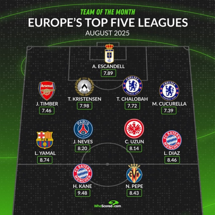 whoscored列五大联赛8月最佳阵: