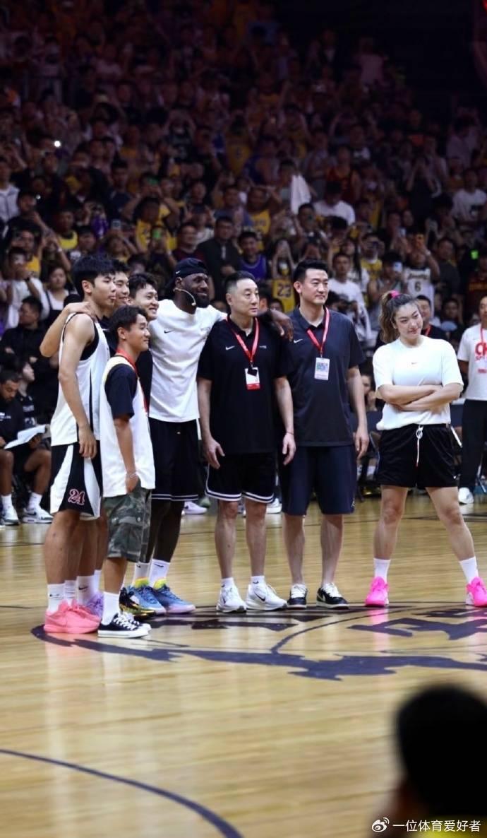 詹姆斯与王非指导、王博指导、女篮运动员李梦、男篮运动员赵睿、崔永熙,足球运动员韦世豪合影留念。