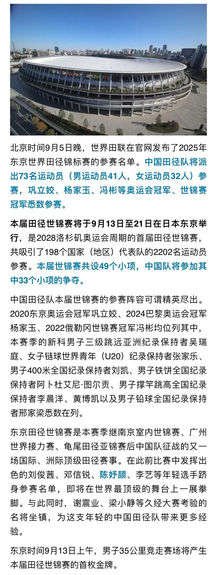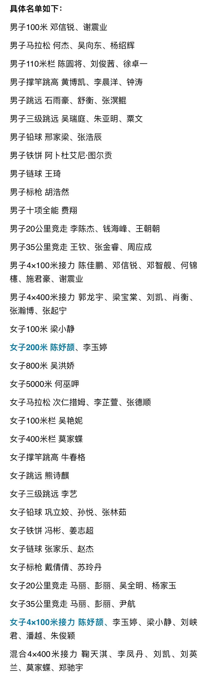 9月5日晚,中国田径队世锦赛名单公布: