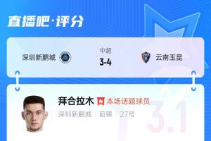 体育资讯03月28日讯 中超第3轮,十人深圳新鹏城3-4不敌云南玉昆,拜合拉木在球队进球后拳击对手染红,赛后仅获吧友评分3.1分。