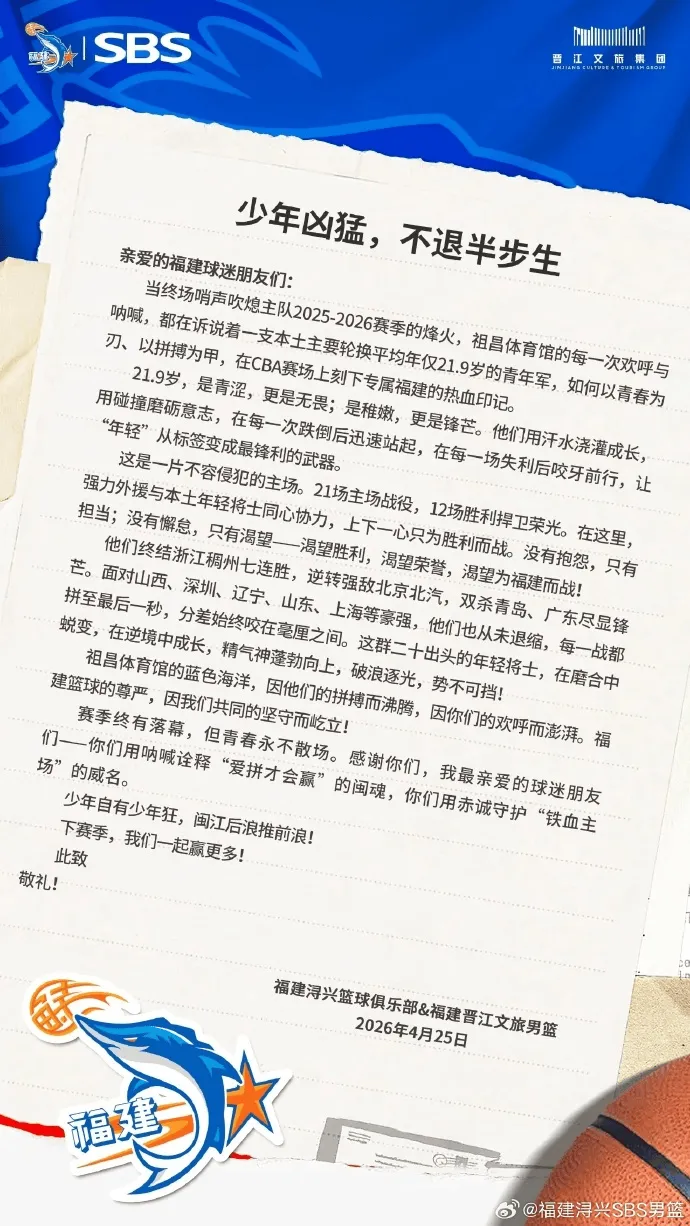赛季终有落幕,但青春永不散场。感谢你们,我最亲爱的球迷朋友们—你们用呐喊诠释“爱拼才会赢”的闽魂,你们用赤诚守护“铁血主场”的威名。