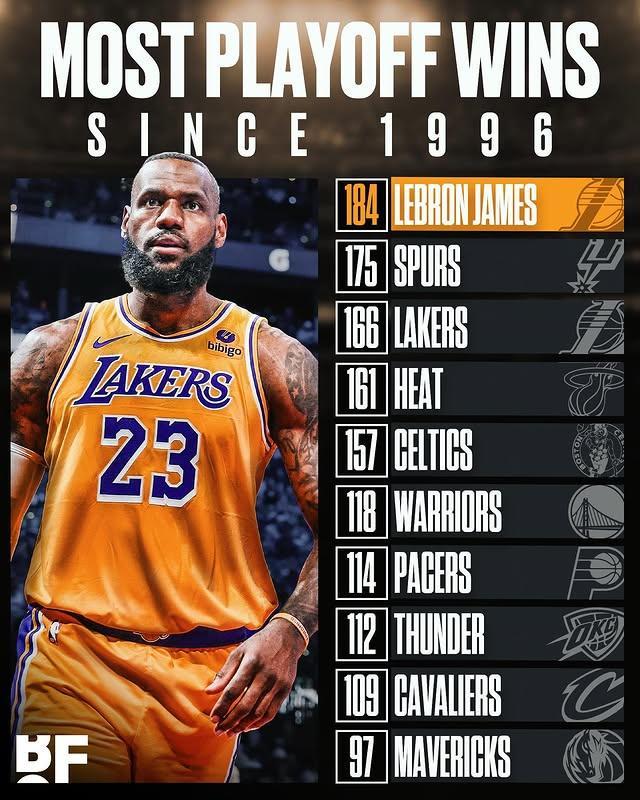 美媒BF晒图,詹姆斯季后赛胜场数184场,超越1996年以来所有的球队,球队里排名前五的是:马刺175场、湖人166场、热火161场、凯尔特人157场、勇士118场。