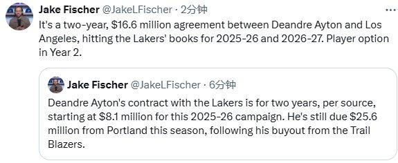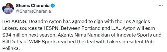 艾顿离开波特兰引多支球队争夺,名记Chris Haynes曾报道,湖人非常有可能引援艾顿,Marc Stein报道,多支对艾顿感兴趣的球队预计他在澄清期之后盟湖人;如今渡过澄清期的艾顿终于终于做出决定,名记Haynes和shams报道,艾顿将加盟湖人,辅佐詹姆斯和东契奇冲击总冠军。